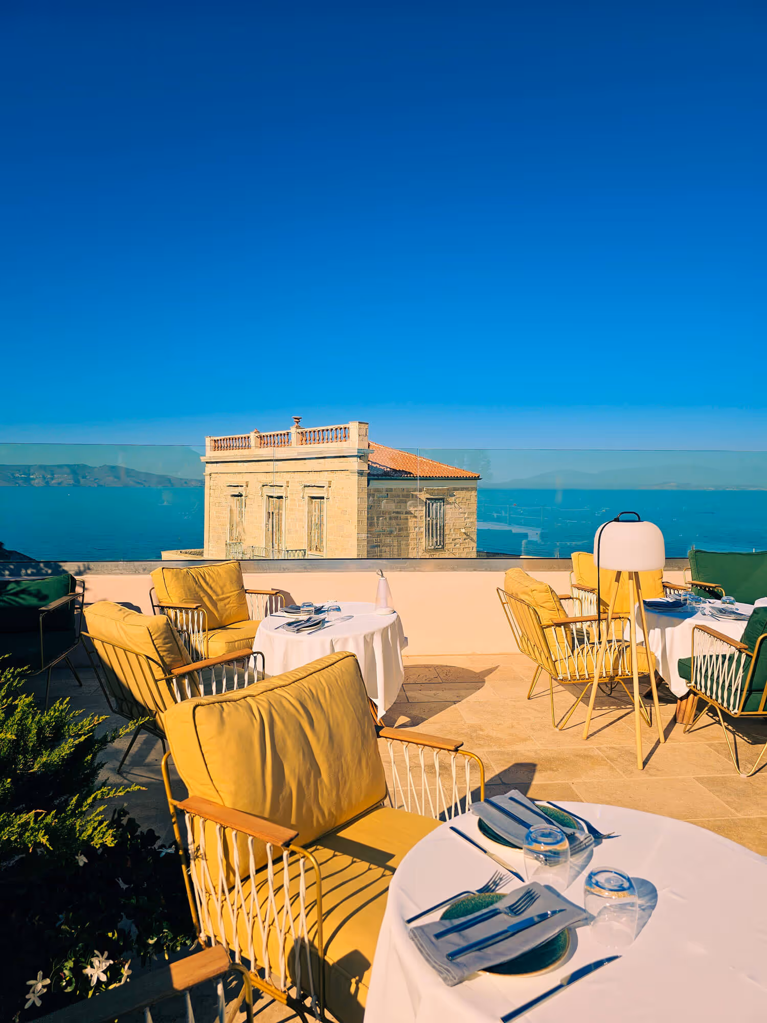 Above it all, a rooftop restaurant opens to the Aegean—